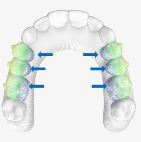 Áreas selecionadas nas superfícies do alinhador agora são contornadas especificamente para aplicar forças à superfície do dente na direção adequada para produzir a movimentação desejada e minimizar movimentações indesejadas.